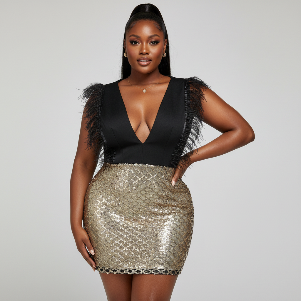 A deep-plunge mini with feathered shoulders and a shimmering sequin skirt. Soft stretch, dramatic shape, and guaranteed attention. A statement dress for any party.
